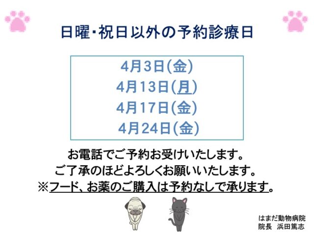 4/3・13・17・24は予約診療日となります|高知市で予防医療・早期発見に力を入れている「はまだ動物病院」です。